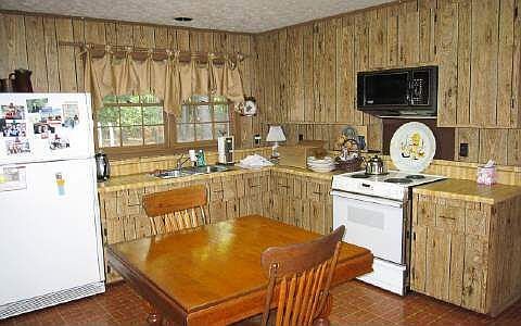 Charming rustic cabin on large level lease lot with boathouse and lift, garage, boat ramp, seawall, beach area, dock, and 200ft of shoreline.Eat-in kitchen is open to great room and the sunroom is large enough for dining. Just reduced!
