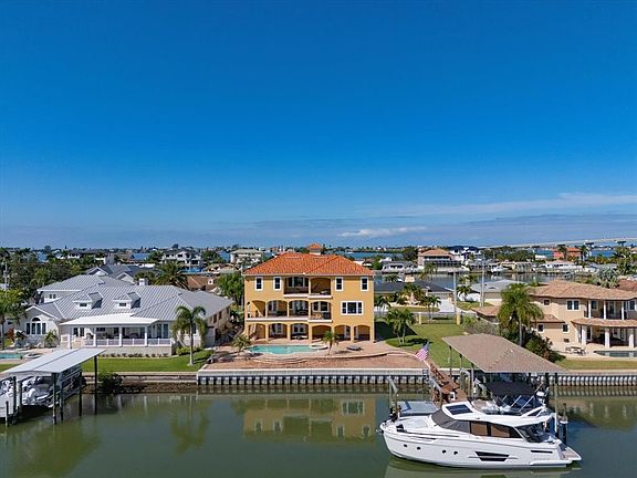 Nestled in the highly coveted Harbor Bluffs community, this Mediterranean-inspired estate exudes grand curb appeal and rests on a rare, almost double lot with tropical landscaping and a pavered circular driveway. Built in 2007, this home meets all hurricane standards and experienced zero water intrusion during last year’s unprecedented flooding, providing peace of mind alongside its luxurious design. Step through the double-door entryway into soaring ceilings and walls of windows and doors that perfectly frame serene water views. The formal living room impresses with wrought-iron accents and chandelier, while the formal dining room, located adjacent to the kitchen, ensures effortless entertaining. At the heart of the home, the spacious dine-in kitchen boasts granite counters, stainless steel appliances, and a large island with seating, all opening to a family room with a cozy fireplace and French doors leading to the pool and outdoor entertaining areas. Enjoy mornings watching dolphins at play from the water-view kitchen, or step outside to relax in your resort-style pool and expansive outdoor spaces, including a beautiful side yard and green space. The primary suite is a luxurious retreat with breathtaking water views, a custom walk-in shower, a soaker tub, two private water closets, ample counter space, and French door access to a covered patio. Additional bedrooms are well-appointed with plentiful closets and water views, while a convenient downstairs guest bedroom offers privacy with its own balcony and access to a full bathroom. Designed for the boating and fishing enthusiast, the property features a covered deep-water slip with 30,000 lb lift and an additional 10,000 lb lift. Additional amenities include a expansive garage, oversized laundry room, and convenient elevator, creating the ultimate combination of comfort, luxury, and functionality. Don’t miss this rare opportunity to own a stunning Harbor Bluffs waterfront estate.