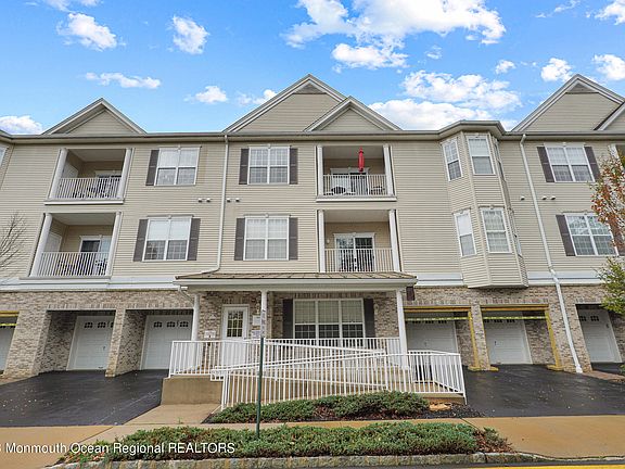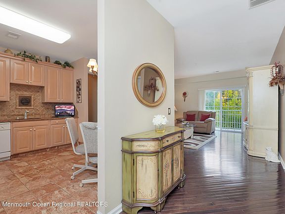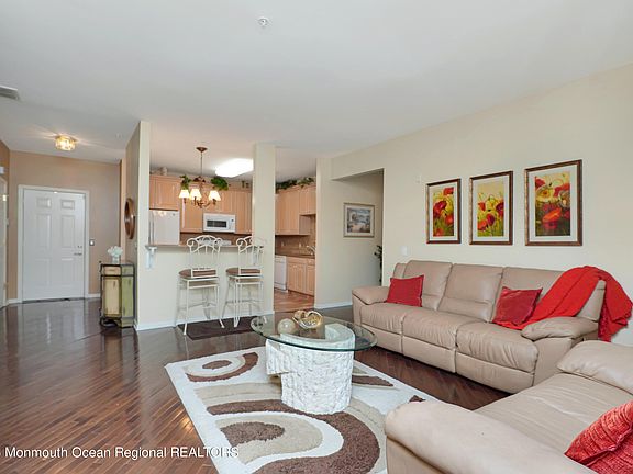 Welcome to Chelsea Square, a vibrant Monmouth County adult community. This lovely 2 bedroom end unit condo provides lots of natural light and is thoughtfully designed, boasting a range of upgraded features to ensure a comfortable lifestyle. Meticulously cared for by its only owner since 2007, you'll notice the stunning hardwood flooring upon entering. The eat-in kitchen features upgraded cabinetry complementing the granite countertops and custom backsplash. A spacious living room offers a cozy, bright spot to unwind with sliding glass doors out to a private balcony with an outside storage closet. The primary bedroom is a retreat of its own, complete with a huge walk-in closet and large windows overlooking the mature trees just outside. And the ensuite bathroom is a spa-like haven, boasting a soaking tub, large shower, and double sinks. The second bedroom is a bright and spacious space for accommodating guests or a home office. And the second bathroom features a tub/shower combo along with a linen closet. You will also find a large laundry/utility room which provides even more storage. Conveniently aligned with your entry door is an oversized 2-car garage featuring a separate temperature controlled storage room. The community amenities feature a stunning clubhouse with fitness room and library, and a multipurpose room for the many social events offered at Chelsea Square. Outdoors, you'll find a beautifully maintained pool with plenty of space to relax. Ideally situated near major roadways for easy access to shopping, restaurants, and entertainment. This is a superb location for those seeking comfort, convenience and recreation.