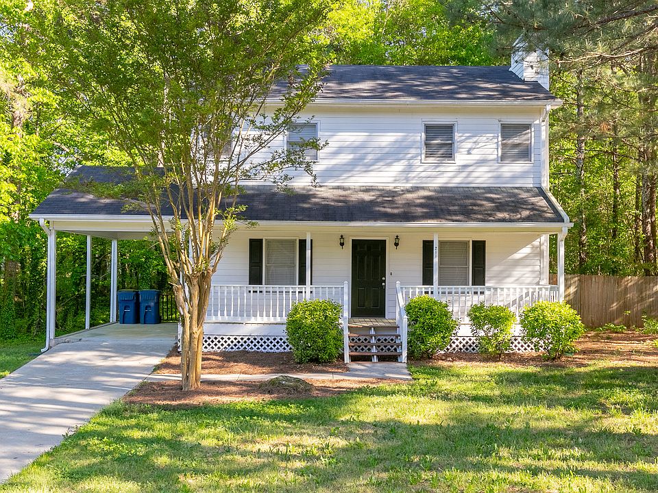 Cute as a Button, Two Story Country Charmer with Rocking Chair Front Porch. New Carpet, Fresh Paint, Private Tree Lined Backyard, Spacious Bedrooms, Updated Flooring, Large Lot. This Home is Move-In Ready!