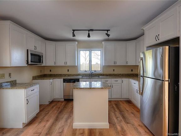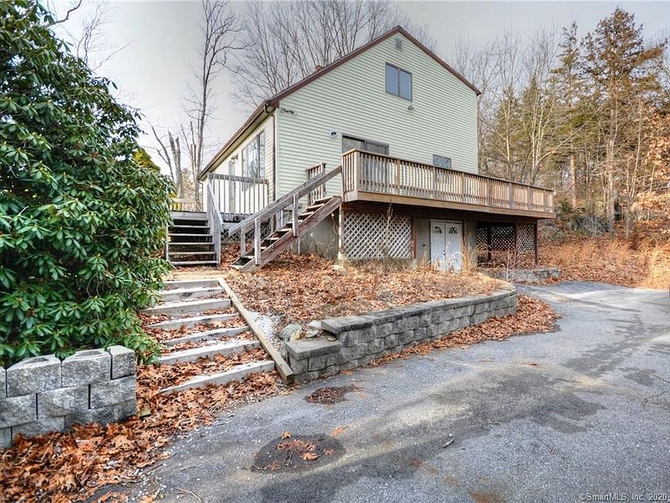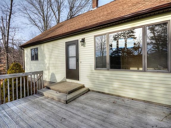 Private and beautifully remodeled 3 bedroom, 2.5 bath Cape. Bright and cheery living room with slider. Eat in kitchen with granite counters, island and new appliances. Half bath on first floor and Atrium door off kitchen that leads to the back deck. First floor master bedroom with full bath. Two generous sized bedrooms on the second floor and full bathroom. Contractors take note the two car detached garage is large enough to park an oversized vehicle. Large secluded lot. Minutes to the highway, Shopping and Mohegan Sun.