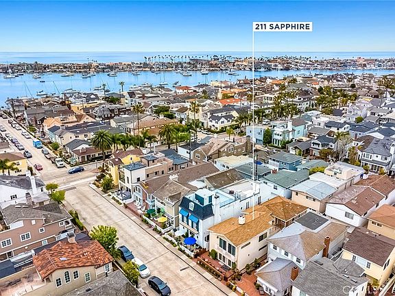 Pristine 5 bedroom, 4 bath Balboa Island duplex, ideally located on lovely "Heart of the Island," Sapphire Avenue. Newly installed laminated floors and fresh paint grace this oversized 2,529 square-foot two-unit home. The first level of the main home encompasses a stately living room with fireplace, adjacent dining room, large kitchen, and 3/4 bath. The living room opens to a sunny front patio, and the dining room faces a private interior courtyard. The 2nd level showcases three bedrooms and two baths, including the spacious primary bedroom. The rear unit can be reached through the main home or its own private staircase. There is a small deck, living/dining space, kitchen, bath, and two bedrooms, including one with built-in bunk beds. A two-car garage, AC, and new underground drain lines complete this superior property.