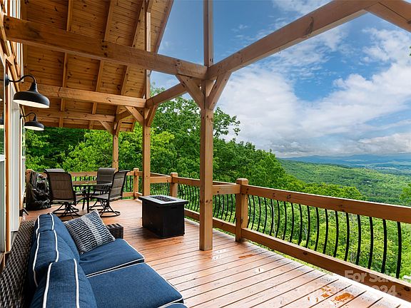 Nestled on the serene slopes of High Top Mountain, this 22-acre haven offers a tranquil escape with breathtaking views of Mount Pisgah & surrounding mountains. The custom-built log cabin, with its soaring vaulted ceilings and expansive windows, invites the beauty of the surrounding wilderness into every room. Each bedroom has its own dedicated full bathroom and private deck. The upper level includes an open loft for added respite. Main level is kitchen-dining-living as one room. The kitchen offers custom cabinets, a copper sink, granite counter & island. The dining area is large enough for a crowd. The unfinished basement has more windows than walls which can easily be converted into 500+ sft of livable space. Another 450+ sft of dedicated storage with bath and workshop is in the basement. Two additional build sites with electric service drops selected. This mountain retreat, currently a cherished home, holds potential as a lucrative rental property.