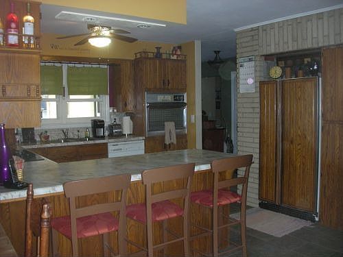 A rare find. There's more here than meets the eye at first glance. Superbly maintained ranch with spacious ceramic tiled entry. Glistening hardwood flooring and massive brick/stone fireplace accentuate the formal living. Captivating kitchen with eating bar, ample cabinetry and charm! Master bedroom features his/hers dbl closets and built-in drawers. Trendy remodeled bath with new counter & vessel sink. Finished lower level provides roomy gaming area, plush family room with additional brick fireplace and full kitchen with appliances ideal for entertaining or family gatherings. Many improvements include Energy Star windows, exterior tiling, new water heater, Bryant furnace. Over-sized garage with storage. A move-in ready home with easy access to shopping, restaurants and schools! Covered porch area ideal for seasonal decorating. Sliding glass doors open to patio with trellised arbor and grilling area.