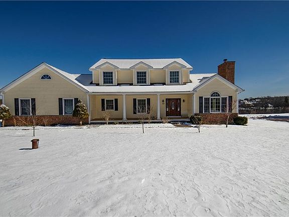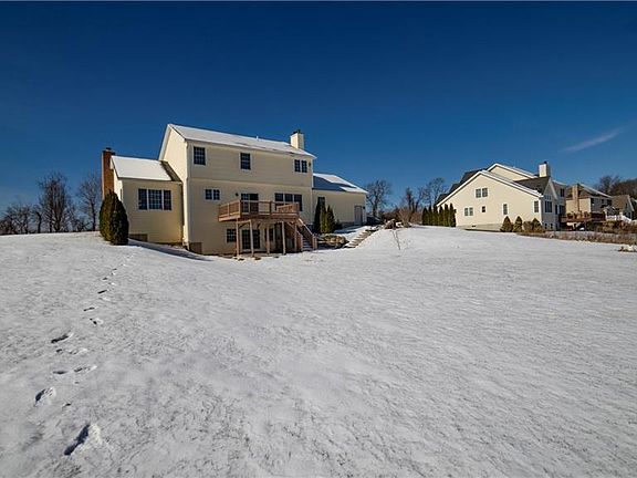 Lovely Colonial nestled on two open acres with beautiful views Welcoming front porch that opens to two story foyer. Very bright home with many big windows and open floor plan.Three car garage. Hardwood floors in every room. Formal living room with fireplace ,vaulted ceiling and french doors. Formal dining room has tray ceiling and french door. The open eat-in kitchen includes high ceiling,recessed lighting, granite counters,pantry, pull out kitchen cabinets ,desk area and granite island with breakfast bar. Kitchen opens up to nice size family room with fireplace including blower. Office /den/4th bedroom, first floor laundry , full bath with walk-in shower complete the first floor. Nice size master bedroom with tray ceiling,walk-in closet and huge master bathroom consisting of large walk-in shower,jacuzzi tub, double sinks and marble floor. Also 2 additional bedrooms in upper level. The unfinished aprx 1600 sq ft in walk-out basement has 10 ft ceiling,custom steel beam construction, roughed in plumbing for potential in-law. From kitchen walk out sliding door onto deck with brick patio below and enjoy the outstanding views and big backyard