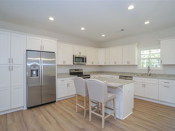 Step inside to an open concept floor plan that seamlessly blends living and dining spaces, creating the perfect environment for entertaining and relaxation. The heart of the home features a sleek kitchen equipped with granite countertops, a spacious kitchen island, and a full suite of stainless steel appliances, including a microwave, dishwasher, range, and refrigerator. LVP in living area/ kitchen and master suite.