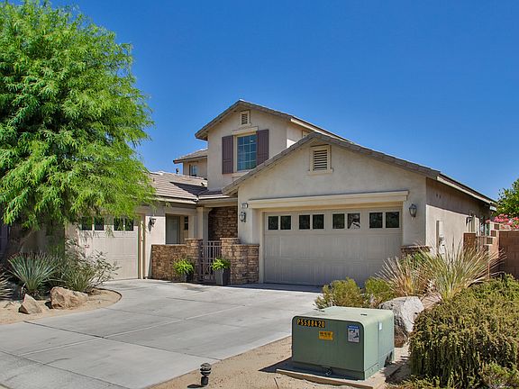 Located in the beautiful Gated community of Campanile, this executive home boasts almost 3500 square feet on a pool sized lot. The property has 4 bedrooms, 3 and 1/2 baths with a main floor master bedroom and attached casita with its own en suite and 3 A/C units. Perfect for the kids, the property has an upstairs loft with two additional bedrooms and a jack and Jill bath that make for their own private retreat. The main floor casita and master bedroom open to a private courtyard and covered patio with mounted sun shades for indoor and outdoor entertainment. Upgrades include, granite counter tops with tumbled marble backsplash, retractable potfiller, tiled flooring, maple cabinets, stainless steel appliances and under mounted center island sink. Adjacent to Rancho Mirage and centrally located in one of Cathedral City's most upscale communities, this property is priced for a quick sale and perfect for the growing family. Community pool & spa, fitness center, playground & BBQ area