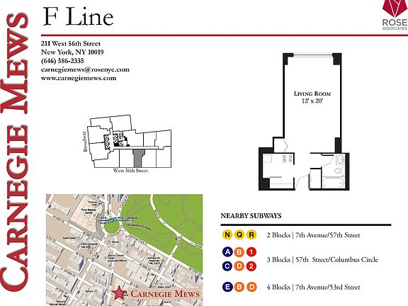Located in the heart of New York's premier neighborhood for entertainment and the Arts, Carnegie Mews offers residents the excitement and convenience of being just moments from Carnegie Hall, Lincoln Center and Central Park as well as The Shops at Columbus Circle featuring a Whole Foods Market, a diverse selection of over 50 retail shops and a collection of culinary and dining experiences. Additionally, enjoy easy access to multiple Subway and Bus lines. Carnegie Mews provides a 24-hour attended lobby, on-site parking garage, valet services and a laundry facility.
