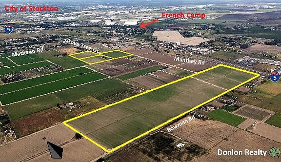 This property is 118.15 combined acres located near French Camp on the west side of Interstate 5 in San Joaquin County, California. The property is irrigated farmland by means of four agricultural wells. The northern property site on Grove Tree Lane is 32.8 acres and is improved with two dwellings, a barn and other outbuildings. The southern property site on Bowman Road is 85.35 acres of open irrigated farmland. Both sites are used for row crop farming.
