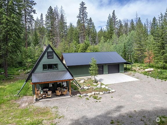 An incredible retreat in the woods will satisfy your needs to get away from the city. This 4.3 acre parcel is adjacent to the National Forest and perfect for the outdoor enthusiast. Located 13 miles from Twisp, up the Twisp River Valley, this updated in 2021 A frame cabin has all the conveniences of civilization, propane, electrical service, and Star Link internet. It is the perfect jumping off point into the National Forest to enjoy horseback riding, biking, snowmobiling, hunting, fishing, and hiking right out your front door. Cabin has a kitchen with eating area, living room, 2 bathrooms, and 2 separate bedroom areas upstairs. A detached 2 car garage is spacious enough to safely store all of your toys.