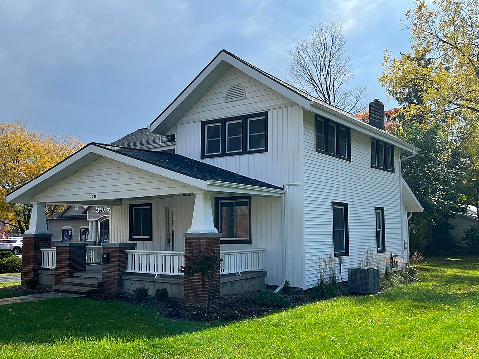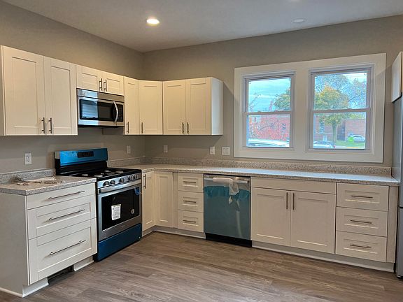 Fully renovated 3 bedroom/2 full bath house with 2-stall garage. New roof, new windows, new siding, new garage doors, new insulation (roof and walls), new plumbing, new HVAC, new air-conditioning, new front sidewalk, new back porch, new drywall, new flooring, new kitchen, new cabinets, new bathrooms, new toilets, flooring is LVT and carpet. Stainless steel appliances included: Oven/stove, Refrigerator and Dishwasher. Main floor laundry with back mudroom entry.