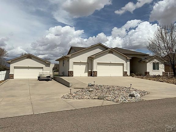 Easy living all on one level on the Pueblo West golf course. Note the large room sizes in this well built and well maintained rancher. This has an open floor plan with split bedroom design. Formal dining room with built in's, gas log fireplace, vaulted ceilings with lighted plant shelves. The kitchen also features tile flooring, all appliances which stay, and a comfortable breakfast nook. The sunroom is tile flooring and has heating and cooling. The spacious master bedroom has a 5 piece master bath and a huge walk in closet with built in dresser. The three additional bedrooms are also large, one being used as a den/office. Ceilings are all 9 ft, R-59 Insulation in the ceilings, all inside walls are insulated between rooms, water filtration system, surround sound, alarm system, perimeter drain. The attached garage is finished and insulated with the 3rd bay used as a man cave/office/exercise area. The detached garage fits a large pickup and has plenty of storage.