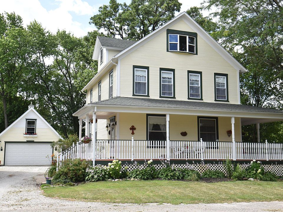 Well cared for three story Victorian home with splendor preservation of oak pillars, pocket french doors, ornate banister and gorgeous hardwood floors Kitchen has been completely remodeled and all the appliances stay. Both bathrooms have been remodeled one with soaking tub and stand up shower. Panoramic view from covered wrap-around porch of Fox river with beautiful sunsets and wildlife galore. Shoreline protection. Beautiful perennials surround the wooded lot. Two car garage with a room above for a shop, exercise room or whatever! ''She shed'' included. (her workshop)