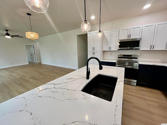 Brand new and ready for you! Built in 2025, this open floor plan welcomes you with a spacious and airy feeling, perfect for modern living. The heart of the home is the large kitchen, featuring pendant lighting over the center island with a deep sink, navy blue lower soft-close cabinets paired with elegant white upper cabinets, sleek quartz countertops, and matching stainless steel appliances with Wi-Fi capability. A door from the kitchen leads you to a cozy back patio, ideal for outdoor entertaining! The luxurious master bedroom suite offers a private bathroom retreat with pocket door, linen closet, 7x8 walk-in closet, double sinks & mirrors, beautiful onyx vanity top and shower surround, and dual showerheads with rainfall for a spa-like experience. The 19x19 drywalled and painted two-car attached garage comes with an overhead opener, floor drain and floored garage with attic access for additional storage space. Situated on a desirable corner lot, this home includes two additional bedrooms, another full bath, entry coat closet, all electric home with 200 amp electric, stylish lighting and tons of outlets throughout! This new construction home offers everything you need all on one level!