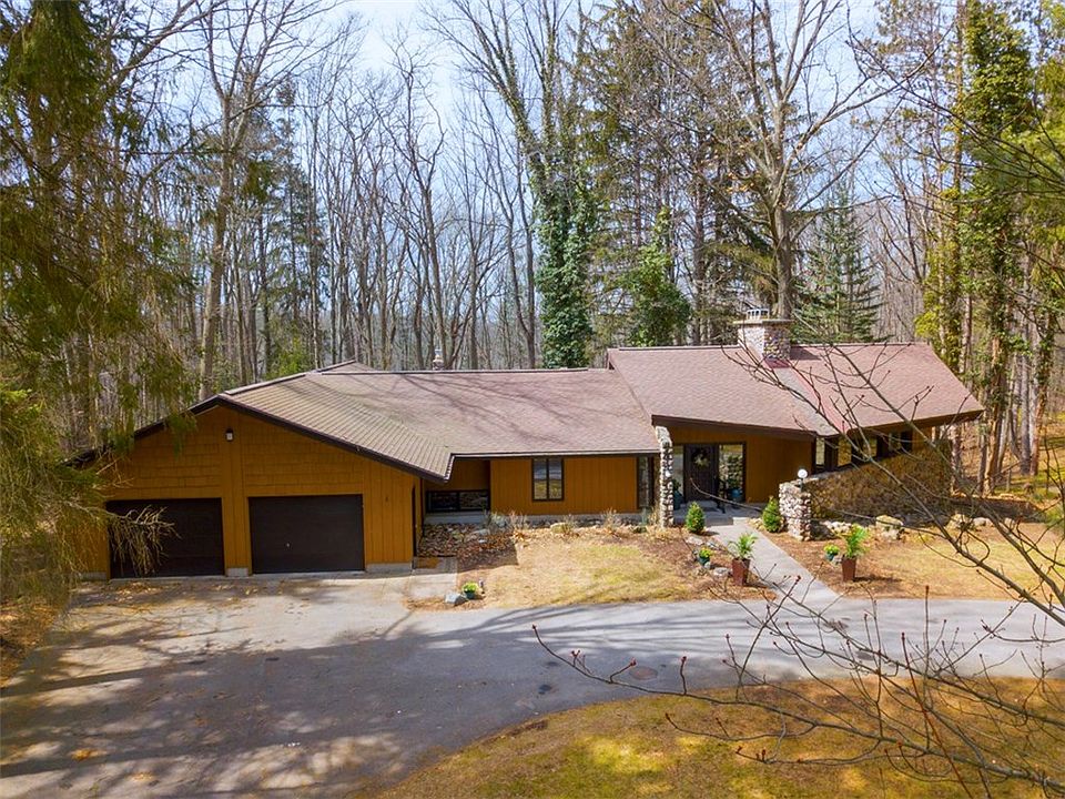 Surrounded by unparalleled beauty this Contemporary Ranch design blends effortlessly into the landscape. Outstanding Craftsmanship throughout. Simple elegance & timelessness. 3BR 2.5 Bath, Den. 1ST FL Laundry. Walls of windows create a connection between the indoor living space & surrounding nature. This home gathers under its roof a contemporary floor plan with warm finishes that include the dramatic stone wall, skylights & cathedral ceilings. Live in a private sanctuary w/serenity & all of natures treasures. A choice property has 30 acres of Burroughs Audubon Nature Trails in its rear yard. Full wall of rock fireplace. Deck with Incredible views. Cent VAC. This one is a MUST SEE!! Highly desirable Fishers Road area. Get the best of both worlds with Pittsford Schools, Ontario Co taxes.