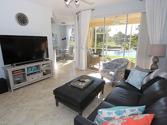 Exceptional first floor coach home in Arielle at Pelican Marsh! Southeastern exposure with gorgeous views of lake and golf course. Fresh and stunning, this residence is spacious with two bedrooms, two baths, a den and screened lanai. Beautifully updated to include granite counters, stainless appliances, custom cherry cabinetry in the kitchen & baths plus all new modern upgraded electronics. Porcelain tile on the diagonal and upgraded lighting fixtures throughout. Tray ceilings with crown molding in the foyer & dining room. All new furnishings in coastal, beach and casual Florida styles set in a palette of new soothing neutral paint colors. Every creature comfort has been provided to make a tenant's stay more convenient and enjoyable. Amenities to Arielle include a heated pool & spa. Enjoy the amenities of Pelican Marsh including an extensive exercise facility known as the "Inspiration Studio", tennis club, social Foundation and security guarded gated entry. This premier community is conveniently located to fine shopping, dining and entertainment, which includes the Mercato located just to the south of Pelican Marsh's main entrance, and is just a quick drive to the beach.