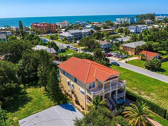This is a custom finished duplex with all the upgrades. This home was built for a builder to live in so no detail was missed. Upon arrival you will see this beautiful Mediterranean design, 3 stories with large balconies off each floor, with balustrade railings. The French doors open to these balconies. On the 3rd floor balcony you will see the intracoastal view across the street. Upon entering the 2nd level you come into the main living area with travertine floors, high ceilings, and custom wood cabinets in the kitchen. The kitchen is central to both the living area and dining room. It has black granite countertops that compliment the accent of black marble in the floor medallions. Roomy and open with a bar to accommodate 4 bar stools. There are balconies off the rear of each floor as well to view the private pool area, and to watch the sunsets. The 3rd level has 3 bedrooms, 2 baths, and balconies to take advantage of the water views. The lower level/garage is finished with floor tile and some custom wood cabinets in the rear. It will accommodate 3 cars tandem or 2 cars and a golf cart, which is popular transportation in Indian Rocks Beach. The lower level goes out to this unit's private pool with plenty of storage and a great pool slide for fun! It's ideal as a primary home, 2nd home or investment property. Rentals are not restricted in Indian Rocks Beach. It is being sold completely furnished. The furnishings compliment the architectural style of the unit completely. Come and see!!