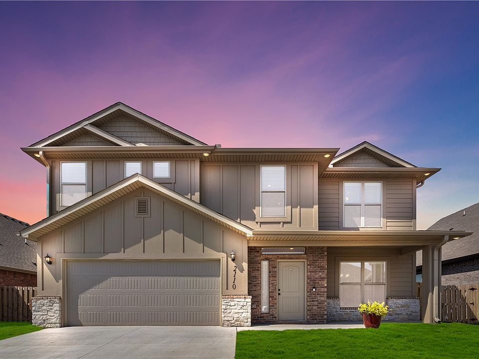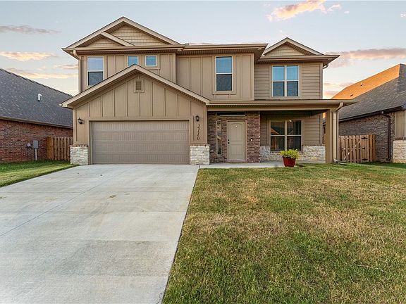 Welcome to 2110 Periwinkle Pl in Centerton, Arkansas! This stunning 4-bedroom, 3.5-bathroom home, boasts 2,575 sq-ft of modern elegance. Located close to schools, parks, trails, and shopping, it offers convenience and style. The two-level layout features two bedrooms with private bathrooms, while the other two share a bath. The spacious kitchen dazzles with leather granite countertops and matching Frigidaire appliances. Enjoy cozy evenings by the electric fireplace and entertain guests with ease using the half bathroom downstairs. The fully fenced yard provides a perfect private backyard. Don't miss out on this gem!