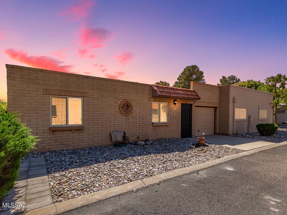 Welcome to this updated east side 2-bedroom, 2-bathroom end unit townhome. Tucked away in the park-like environment of the highly desirable Rolling Hills Villas. You will find mature trees and lush greenery throughout this beautiful community. Inside the home you will find polished concrete floors, newly painted doors, and rustic wood slat accents to create a modern and sleek aesthetic. Windows are tinted and provide excellent energy efficiency. The enclosed patio/atrium adds unique charm & provides a peaceful space. The large primary suite has a new bathroom vanity, lighting, and flooring. From the primary there is a door to the garage and laundry, as well as a slider for natural light and an exit to the enclosed atrium. The galley kitchen has a breakfast nook and pantry closet. The attached 1 car garage offers convenient parking and plenty of storage. The seller was using this space as a wood shop. Located around the corner from the community pool. Golf membership and RV parking available! Conveniently close to shopping, the loop for cycling, Saguaro National Park East, schools, and restaurants. This home is going to go fast! Don't wait.