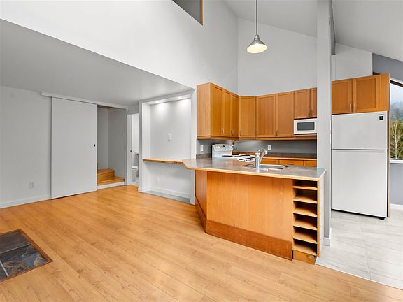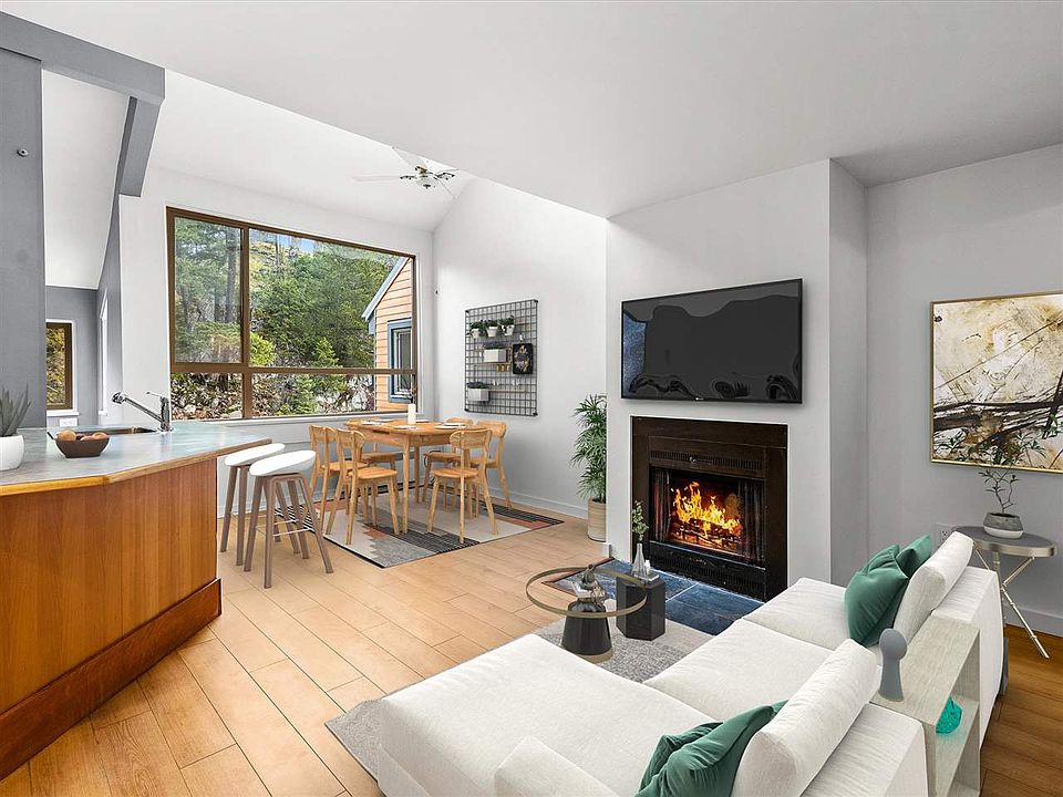 Flawlessly fresh townhome with updates! A quick stroll to the Creekside Gondola and all the amenities, this property has it all. Substantial building envelope renovation completed about 5 yrs ago (cladding, metal roof, wooden walkways, windows), new flooring, paint throughout, popcorn ceilings removed, hot water tank under warranty, and updated electrical. Unit features 3 "master" bedrooms with ensuite, a bonus powder room on the main floor, main floor laundry, lovely/bright dine-in kitchen, vaulted ceilings, steam shower, wood burning fireplace, new alcove entertainment centre with custom live edge shelf. Perched high on the North East side of the complex there is an abundance of light and breath-taking views of the surrounding mountains & vistas of neighbouring Bottomless Pond Park.