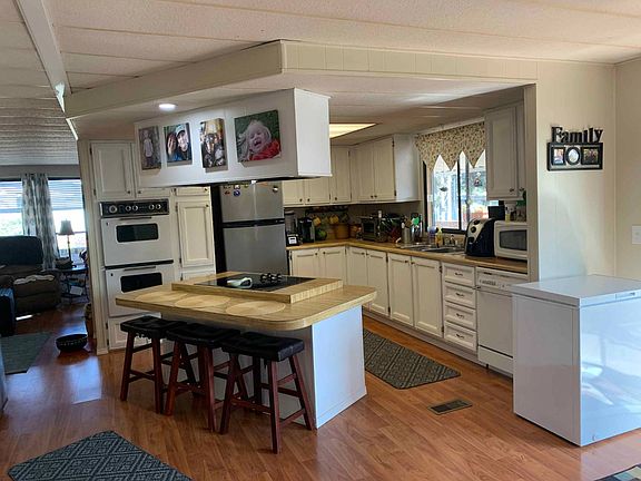 Sit out on the deck or enjoy the fireplace, you can choose! This is a spacious 2 bedroom, 2 baths with a great floorplan. Lots of windows for natural light to create such a cheerful home! The kitchen is very open and inviting. Lots of nice cupboards for storage and an island with a flat surface range! Meals can be served in a separate, roomy dining area with built-in cabinets! Enjoy the family room area when you don't feel like using the livingroom! It might be hard to choose because the living room has a fireplace and so much natural light! And the family room opens onto the deck! The Master bedroom has a master bath with an oval garden tub and lots of storage space! The second bath has dual entry into the second bedroom and hallway. The deck is very spacious, the yard is fenced, and there's an 8 x 12 shed for storage as well. Home needs some TLC but what a place to retire with time to do it! This is a 55+ park.