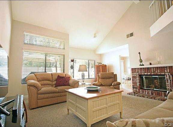 SPACIOUS END UNIT AND UPGRADES THROUGHOUT! Awesome floor plan offering a large living and dining room with brick-accented fire place & soaring cathedral ceilings. Family room/nook with sliding glass door access to the yard and opens up to the gourmet kitchen, boasting newer & upgraded granite countertops, GE Profileâ„¢ stainless steel appliances, newer & upgraded cabinets, pantry, stainless steel sink & upgraded faucet, added recessed lighting & crown molding and large breakfast bar. Upgrades include newer & upgraded carpeting, wood grain ceramic tile floors, custom baseboards, newer & upgraded HVAC, granite countertops in all bathrooms, upgraded lighting, water softener, two tone interior paint, six panel doors, & more. Grand master suite offers vaulted ceiling & walk-in closet and spacious master bathroom with large vanity with dual sinks & newer & upgraded cabinet. Spacious second & third bedrooms, hall bathroom with granite vanity, and landing with linen cabinets. Two car attached garage and private rear yard with brick-accented patio area, custom patio cover and upgraded vinyl fence. Resort-like HOA amenities include pool, spa, tennis courts, basketball court and close proximity to large park with baseball diamond, basketball court and sand volleyball!