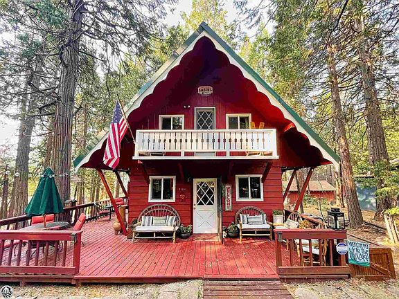 Over the mountain and through the woods to your charming cabin we go! Nestled into the pine and cedar trees, this mountain retreat will delight with the perfect balance of indoor and outdoor living. Impeccably designed and decorated this fully furnished home is inviting, relaxing and waiting for you. Walk into the main level living with open beam 9 foot ceilings, warm rustic pine wood walls with rustic touches and durable oak hardwood floors. At the heart of the home, heat is provided by a wood fireplace. The kitchen has a quaint dining nook, a well thought out kitchen with granite countertops and stainless steel appliances. There's a full bathroom and hallway laundry. Upstairs there are two spacious bedrooms with a balcony. Enjoy the exterior decking complete with barbecue and open ground space for all your outside activities. Stand in awe of the massive cedar tree in the front yard with it's natural sculpted beauty. Buy with confidence as this home has a 2 year old septic system, metal roof and easy access from the street. It doesn't get any more charming than this unique cabin.