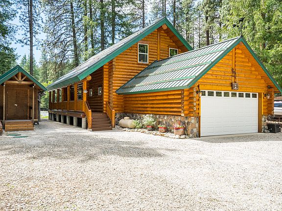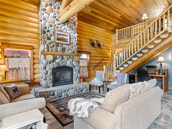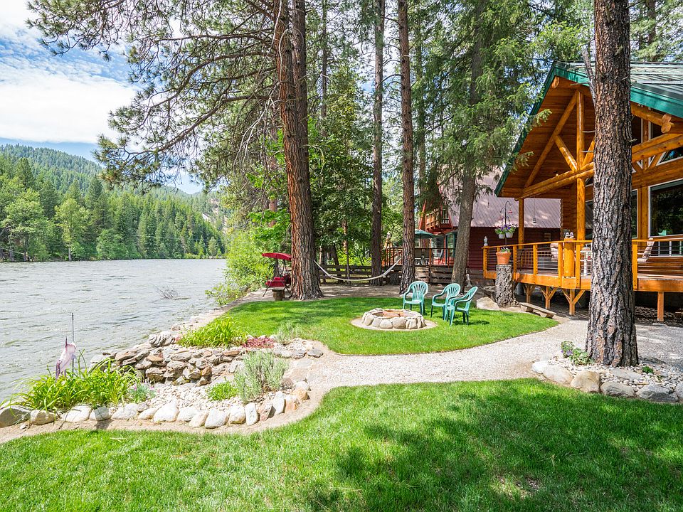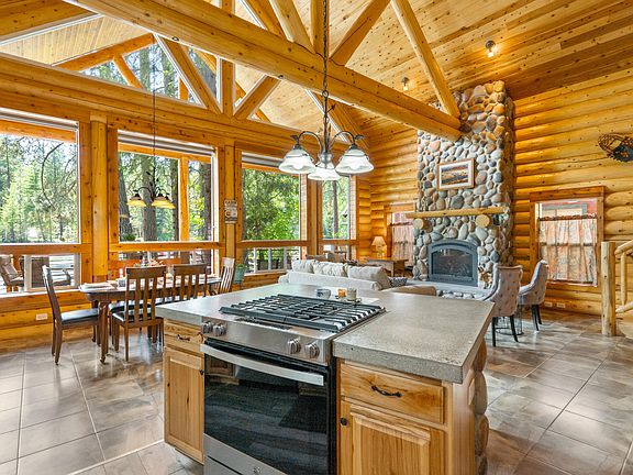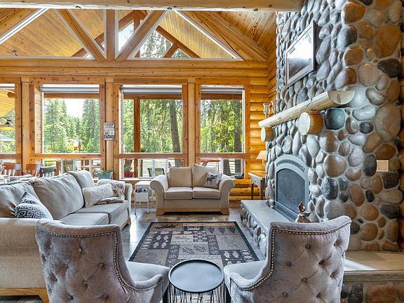 Stunning log home on the Wenatchee River outside Leavenworth! This 2-bedroom, 1.5-bath home offers an incredible lodge-like feel with its massive log timbers, soaring vaulted ceilings, and tons of windows that capture the beauty of the river outside. Radiant heat floors, large kitchen center island with concrete countertops, gas range, hickory cabinets, a floor-to-ceiling river rock fireplace, log railings, and tongue-and-groove cedar ceiling. The open loft bedroom sleeps an entire family in itself. Outside you will love the oversized covered deck, lawn area, and 70+/- feet of low-bank frontage. Attached 2-car garage, covered walkway to the front door, and close proximity to the community swimming pool.