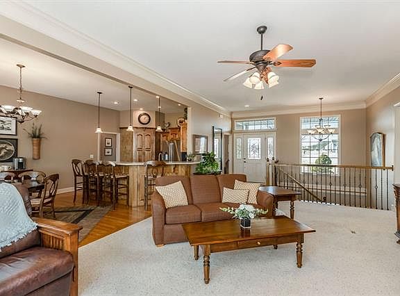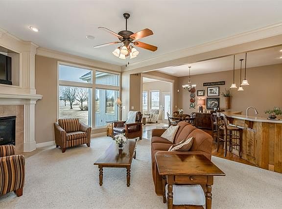 Crisp, clean and offers so many upgrades. This amazing open concept home offers incredible golf views of the fairway from your front and back yard. Upgrades galore. Fresh interior and exterior trim paint in 2021, New double pane windows 2020, built-in surround sound inside and outside, new sump pump and battery backup 2020, New hot water heater 2020, UV light purification on the HVAC, attic fan, extra deep garage, oversized safe room, Expanded stamped concrete patio for all your entertaining needs and so much more. Incredible floorplan offers walls of windows with a serene view of the golf course, pond and acreage. Open concept living at its best with family room that offers a gas fireplace, sun lit sitting room, lovely kitchen with stainless steel appliances, built-in microwave, walk-in pantry and Corian counters. Spacious master suite & en-suite bath with awesome space. Spacious 2nd bedrooms. Spacious finished lower level offers rec space, living room space and game room area. HUGE unfinished area for all your storage or additional living space. Quiet Cul-de-sac lot tucked on the golf course. This is a must see! 2021-02-08