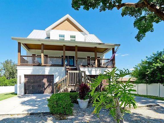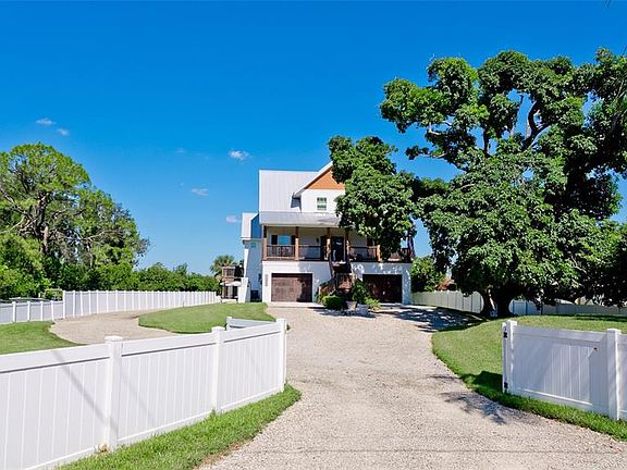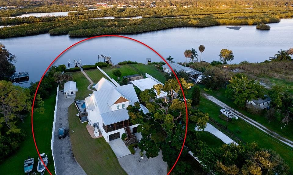Welcome to this stunning 3-story oasis, perfectly perched on .73 acres, overlooking serene nature islands and offering breathtaking sunrises. This exceptional property features a boat dock with a 10,000-pound lift and a floating jet ski dock, making it a water lover's paradise. Enjoy a lagoon-style heated pool with a spa and a dedicated storage house for pool toys and boat equipment—all without HOA or CDD fees! The meticulously designed interior boasts 9-foot ceilings throughout, with a ground level featuring a completely surrounded concrete block room that can have many uses such as workshop, storage or for safety in case of storms. Don't forget a sauna and a spacious 3-car garage and a home fitness area. Step onto the expansive front and rear decks on the second level, complete with a barbeque deck hooked up to a 500-gallon propane tank that fuels one of two cozy fire pits. The open floor plan highlights a modern kitchen with white shaker soft-close cabinets and a stunning granite island, flowing seamlessly into the living and dining areas. The primary bedroom offers custom wood moldings, an en-suite bathroom with a luxurious 6x5 walk-in shower, double sinks, and quartz countertops. The third floor hosts two additional bedrooms, each with walk-in closets—one also featuring a bonus space perfect for an office or nursery. Additional highlights include dual AC units, a beautiful iron and wood staircase, and thoughtfully designed outdoor spaces with cypress ceilings. Spot dolphins, manatees, and various bird species right from your home! With a whole house generator and every inch of this home crafted with intention, this property is a true testament to luxurious living. Don’t miss out on this unparalleled waterfront gem!