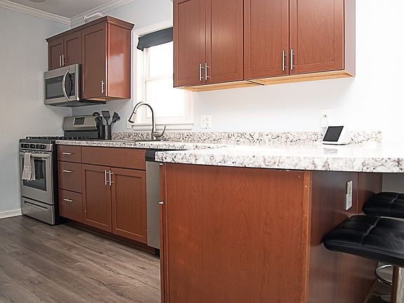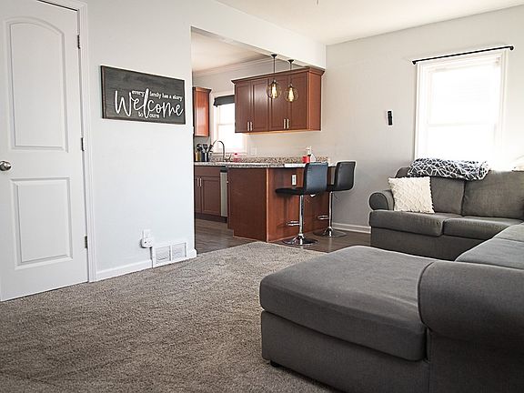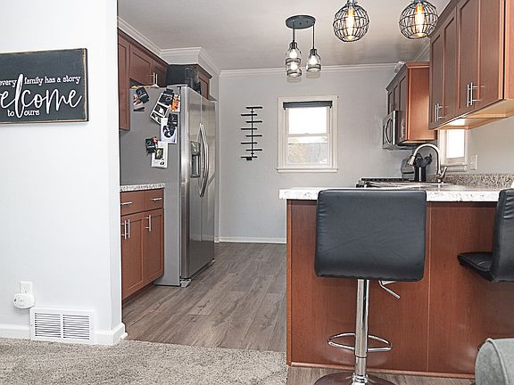 Walk in to this recently remodeled home featuring a beautiful kitchen with eat in peninsula, and a built in custom wood entertainment area. The main floor has 2 bedrooms and one full bath with fresh paint in the bedrooms. The basement has a 3/4 bath plus a non-conforming bonus bedroom in the finished basement with a custom wood accent wall. The AC was replaced in 2022. On the outside the home has a brand new roof, siding, and gutters installed in October 2022, and an oversized detached 2 car garage. You'll enjoy this shaded tranquil corner lot
