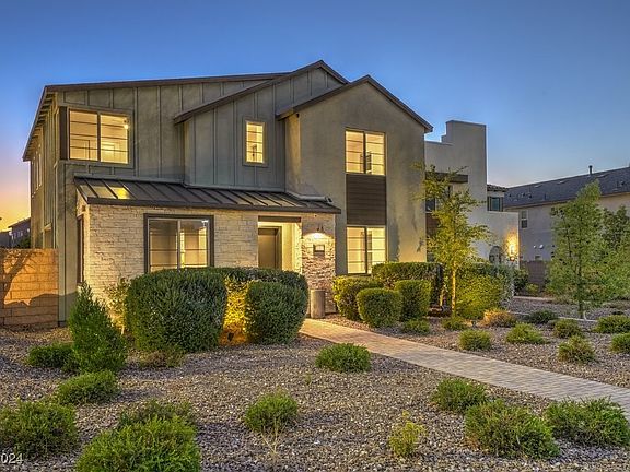 Modern luxury abounds in this 4 bedroom POOL home in sought after Inspirada neighborhood. Situated on a rare double cul-de-sac lot, this Tri Pointe gem has something for everybody. From the designer courtyard, to the soaring ceilings, to the open concept living area that leads out into the dream backyard, this property was made for entertaining. Infinity edge spa spills over into the sparkling pool, and there's plenty of covered patio space to barbeque and relax and enjoy year round. Prepare delicious meals in the chef's kitchen, which features stainless appliances, subway tile backsplash, sleek pendant lights and a walk in pantry. There is a guest suite downstairs, and upstairs features two additional guest suites, an enormous loft, and the primary retreat with vaulted ceilings, custom closet, and spa-like bath. The three car tandem garage has epoxy floors, overhead storage and a work bench. No details missed in this beautiful home.