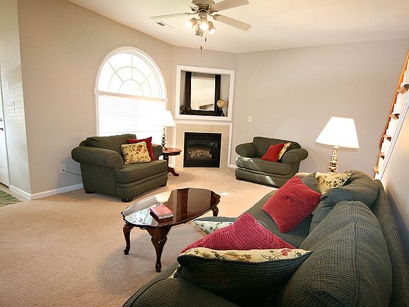 Beautiful townhouse-style condo with bright & open floor plan & 2 master suites. Great room has gas log fireplace, TV niche, ceiling fan & huge palladium window. Kitchen has laminate hardwoods, dining area with door to patio, breakfast bar, lots of cabinets & black appliances. Both bedrooms are spacious & have ensuite bathrooms - 1 has jetted tub, dual vanity & 2 walk-in closets. Private over sized patio overlooking wooded buffer. Privacy fence & exterior storage room. HOA maintains exterior & lawn.