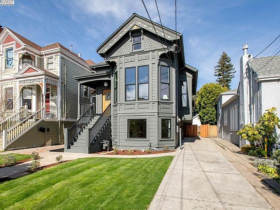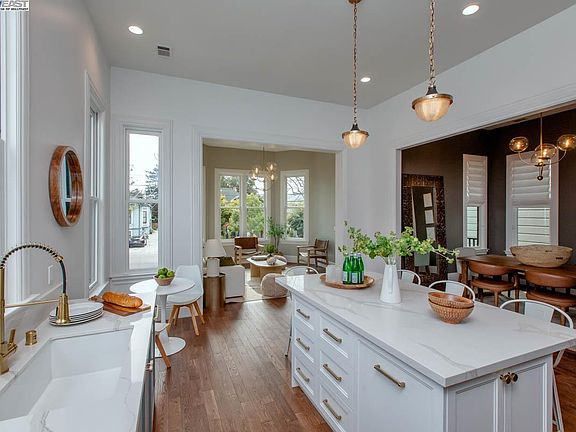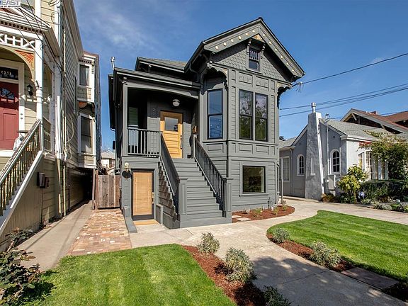 In a Bronze Coast neighborhood filled with beautiful Victorians, this 1875 Queen Anne Victorian is in a class by itself. Completely taken down to the studs in a 650K renovation by the present owner, this stunning home offers Victorian architectural details within a beautifully professionally designed interior complete with luxurious finishes in a versatile floor plan designed for a contemporary lifestyle. No expense was spared in creating this exceptional home that includes 5+BR, 4BA, formal living/dining rooms, a fabulous chef's kitchen, family room and laundry room. A sunny lower level ADU with its own entrance has 1BR, 1BA, a LR/DR, kitchenette & laundry. Details include: High ceilings, bay windows (both levels), marble/quartz/porcelain kitchen + bathroom finishes, hardwood floors (engineered), and new interior/exterior paint, electrical, plumbing, light fixtures, roof, furnaces/ducting and so much more. The permitted ADU offers potential rental income, or can easily be incorporated into the main home as a family/teen space, home office, or used as an apt for multi-generational living. Located just 3 blocks to the heart of downtown Park St & less than 1 mile to Trader Joe's + S. Shore Center shopping, this is an exceptional home in a convenient + sought-after Alameda location!