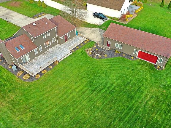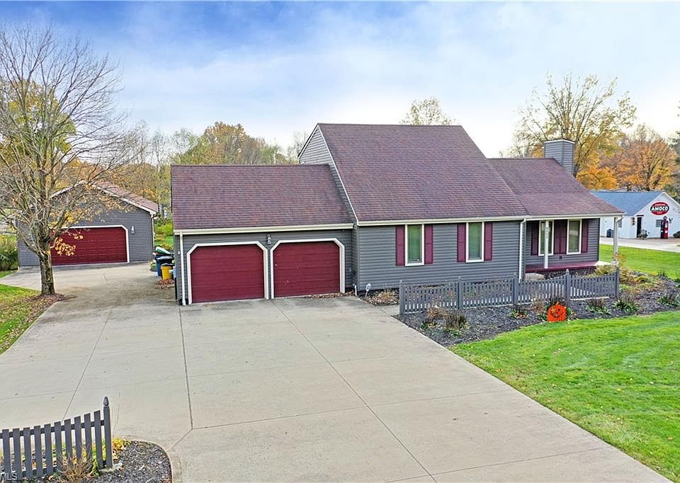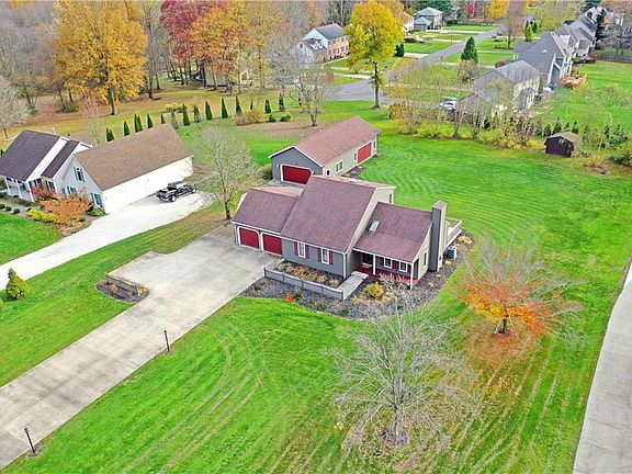 Enjoy this massive Liberty estate, complete with an equally impressive rear patio and a substantial finished outbuilding, divided for shop and storage space alike. The long concrete drive leads up to the home's attached two car garage while the pad continues back to the outbuilding as elegant landscaping wraps the bold green home that changes color in the sunlight. A grandiose foyer showcases tall ceiling with adjoining lighting fixtures as the main hall and carpeted second floor staircase reside nearby. Opposite, the illustrious and sky-light lined living room drops down to reveal rich woodwork and lush mauve carpets the center on the fireplace. Formal dining is accessed by the far entrance before finding the central kitchen. Here, the tiled room houses casual dining and custom wood cabinets as you enjoy backyard views. A short hall continues past a half bath to beset garage entry and a relaxing family room. The first-floor master bedroom joins a robust full bath to complete the floor. Upstairs, an additional pair of inviting, carpeted rooms wrap the landing as they accompany an additional full bath with stylish, tiled shower. A third shower can be found at basement level amongst storage, while the outbuilding contains its own restroom along with overhead, gas heating.
