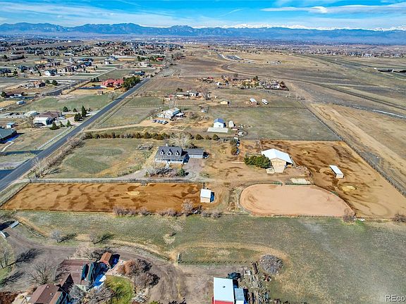 Spectacular 4.34 acre horse property with quintessential farmhouse complete with wrap-around front porch, dormer windows and even a vintage wood burning stove. Enjoy stunning mountain views from this amazing property that is zone A-1, fully fenced and set up for horses including a huge 3 stall pull-through barn with electricity & water, 2 separate pastures each with loafing sheds & water and an arena. Inside you will find a beautifully updated home with refinished hardwood floors on the main level and new carpet on the upper level. Kitchen boasts granite counters, SS appliances and convenient breakfast nook. There is also a formal dining room and charming family room right off the kitchen with vaulted ceiling & wood burning stove. The main floor primary suite features an abundance of windows, new hardwood floors, 5pc bath and walk-in closet. The finished basement has an additional bedroom with adjacent 3/4 bath, huge rec room, office space and even a craft room. Enjoy beautiful sunrises from the east facing front porch or enjoy your favorite beverage watching sunsets on the large stamped concrete patio in the back. Sellers have done numerous upgrades to the home: new carpet (2023), new water treatment service (2023), refinished hardwood floors (2022), new sod & sprinkler (2022), new boiler & on-demand water heater (2022), new solar gate motor (2021), new exterior paint (2020), new central AC (2019), new leach field (2018) new roof (2012). The home offers the best of both worlds with quiet country living yet only minutes from the conveniences of the city including the Orchard Mall, Top Golf, Denver Premium Outlets, AMC Theaters, Target, Costco, and quick access to E-470 and I-25. Attached 3 car garage, finished basement, central vac, circular driveway, motorized front gate, low taxes, no HOA, chicken coop, fenced garden, unobstructed mountain views, backs to Broomfield open space - this home has it all. Hurry!