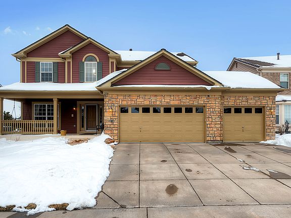 A charming 2-story home with fully finished walk out basement, professionally landscaped in Parker with 6 bedrooms, 3 1/2 baths. The main floor features an open concept kitchen and living room with gas fireplace. Step out onto the deck right off the kitchen to your own backyard sanctuary with water feature, gas fire pit, and play structure. The master offers vaulted ceilings, linen closet, 5-piece bath, and an oversized walk in closet completely organized with shelving. The rest of the top floor includes 3 additional bedrooms and full bath. The finished walk out basement features a bedroom with full ensuite bath, study (or sixth bedroom) and great room with fireplace and 50” flat screen included. The house also offers plantation shutters, built ins, and closet organizers in most closets. A south facing 3 car garage with workbench and storage, awaits the new owner. Located just 2 miles from downtown Parker’s Main Street this home cannot be missed.