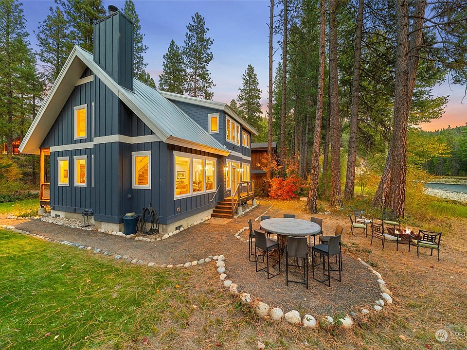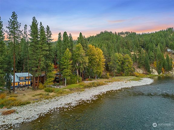 Ponderosa Perfection: Discover this idyllic, like-new chalet set on breathtaking, low-bank Wenatchee River frontage. This fresh, sun-filled escape offers a dramatic vaulted kitchen/living/dining space featuring a gorgeous wall of windows showcasing sparkling riverfront views. This thoughtful floor plan features a beautiful main-level primary suite, a custom staircase leading to a spacious loft, 2nd bedroom, a full bath, and a bonus room upstairs. A detached garage with ample bonus space above stores toys and tools in style. Imagine sipping coffee on your rear sunporch, sunset BBQs, and evenings gathered around the fire pit. Plus, this location is a hop-skip to the community pool, playground & pickleball courts. A rare riverfront retreat!