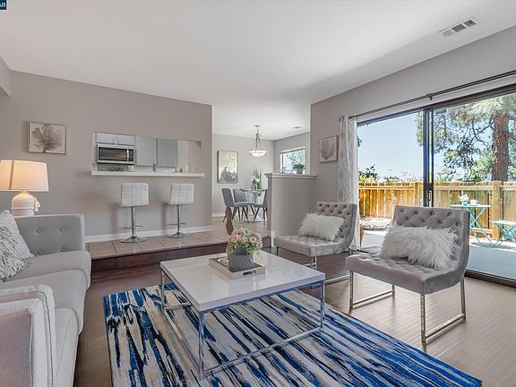 PRICE IMPROVEMENT YOU CAN'T PASS UP!!! Welcome to this unique & rarely available 3 bed 2 bath garden condo with expansive wrap around patio/deck with Bay views at the gated Mesa Verde known for its resort like amenities and lush landscaping. The open concept living space includes kitchen, dining area, and living room. Kitchen boasts stainless steel appliances, new range, microwave , refinished counter tops, freshly painted cabinetry with European hinges and new brushed nickel hardware. Step down to the living room to relax and/or entertain next to the cozy fireplace or step out the slider onto the flagstone patio and enjoy the view of Ponderosa pine, rosemary bushes, birds of paradise & much more. Primary suite includes refinished double vanity, walk-in closet, and slider to private deck. Ample sized second and third bedrooms with mirrored sliding closets. Interior freshly painted. Newly refinished countertops, vanities, bathtub & shower & and surround. No shared walls and no buildings in front of living area. Shared garage +1 uncovered.Water & trash included in HOA. Complex FHA approved. Easy access to 580,238 & BART. Don't wait to be embraced by the breeze of the Bay!