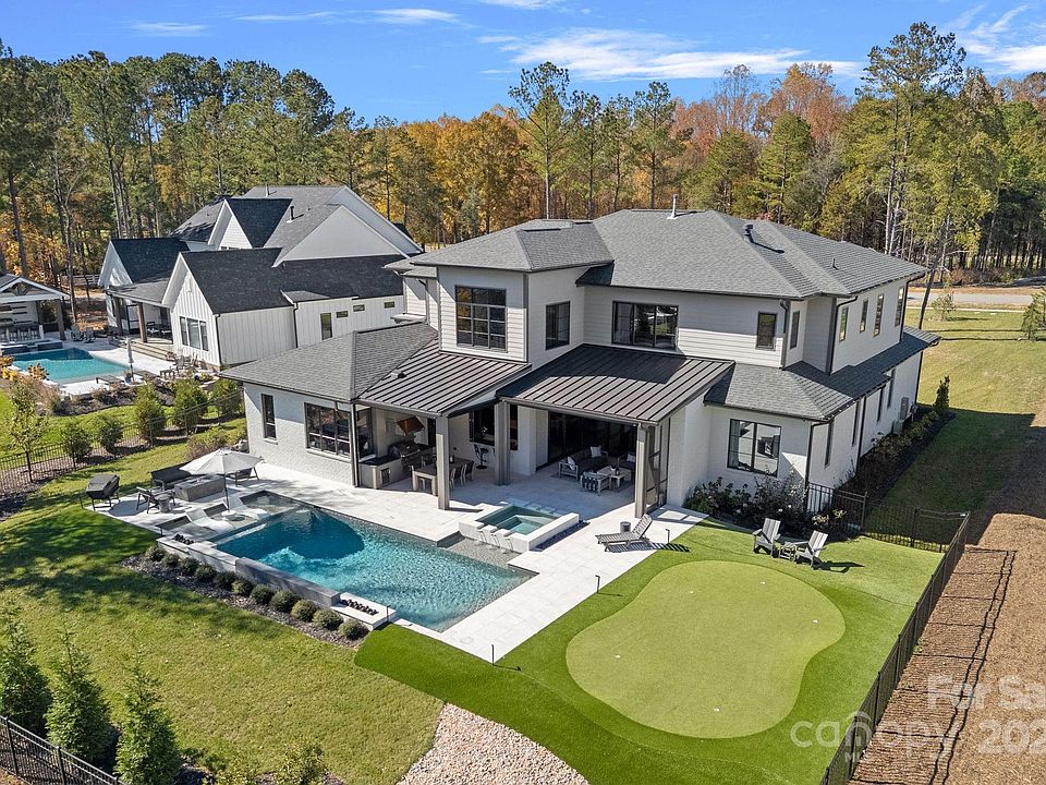 Located in Davidson Farms – Stunning Modern Home by AR Homes. This exquisite residence boasts spectacular features throughout. The primary bedroom, guest suite, and a dedicated office/den are conveniently located on the main floor, alongside a large open kitchen that includes a pass-through window to the covered porch. The great room and bar/wine room create an inviting space perfect for entertaining.Enjoy seamless indoor-outdoor living with pocketing doors leading to a covered porch equipped with remote retractable screens, a cozy fireplace, and an outdoor kitchen. A luxurious heated salt-water pool and spa add to the outdoor oasis, complemented by a 676 sq. ft. putting green featuring five cups.The kitchen is a chef's dream, featuring custom cabinetry, quartz countertops, a professional 48” range with dual ovens and six burners, plus a 48" built-in refrigerator. The spacious walk-in scullery includes a sink, dishwasher, and an additional refrigerator for ample storage.Retreat to the primary bath, which offers an oversized wet room, quartz counters, and a freestanding tub. The large, bright foyer with a floating staircase invites you into the home.Upstairs, you'll find a bonus room, club room with a wet bar, and a media room, along with three additional bedrooms, three full baths, and a half bath. There's also flex space ideal for an exercise area or playroom or walk-in conditioned storage space. Additional features include a upgraded/luxury lighting throughout, sealed crawlspace and a three-car side-load garage, making this home both practical and luxurious. Feature sheet in attachments.