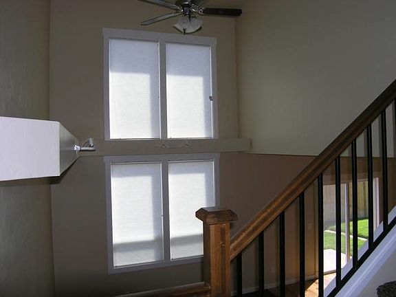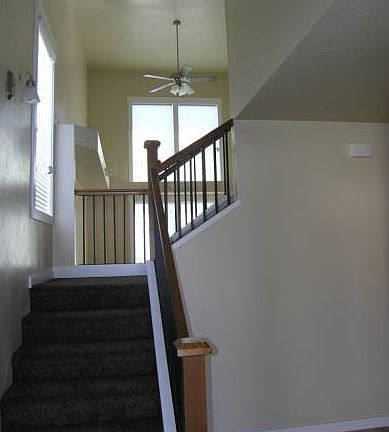 Newer Patio home. Oak hardwood flooring downstairs. Two story living room with plant sheves, all bedrooms up stairs. Oversized two car garage. Blinds and refrigerator included. Available starting first week of April. Photo similar.1-year lease.Available 4/1/14