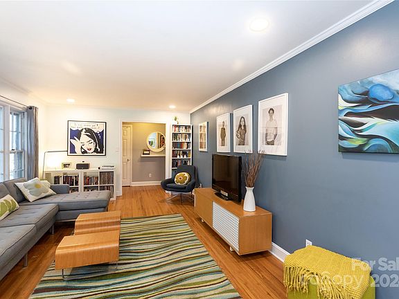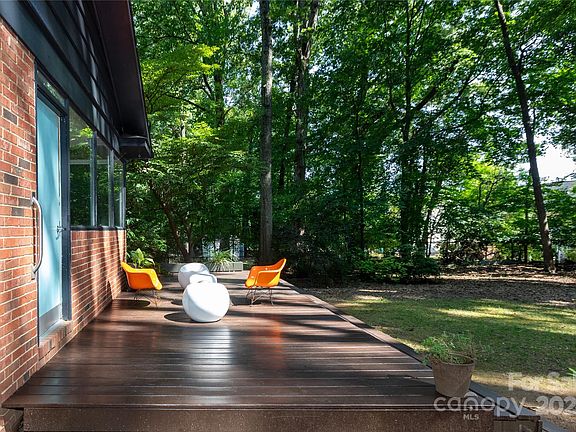 Discover this exquisite mid-century modern ranch in Montclaire. Crafted by an interior architect, this home blends contemporary elegance with timeless charm. The kitchen features Corian and Silestone countertops, a wall oven, and an island overlooking a cozy wood-burning fireplace and built-in bookcase. The primary suite offers two spacious closets and a newly renovated bathroom (Summer 2024), while the hall bath presents custom penny round tile. Unwind in the sunroom and enjoy the serene, tree-filled backyard with a deck and patio, perfect for entertaining. Sunroom is used year-round and not included in the square footage. This property also features a rare carport with a workshop. Move-in ready with 2024 updates: new HVAC, water heater, fresh paint, smart bathroom fan, and new carport roof. Easy access to the greenway, light rail, SouthPark, South End, and Uptown. Extra parking available on Delchester.