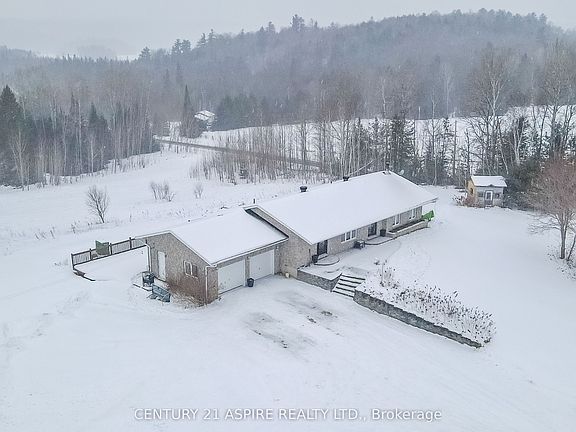 This gorgeous property on just over 6 acres of private land offers breathtaking views of surrounding areas and valleys just outside of quaint and charming Palmer Rapids. This stunning stone home features 3 bedrooms, a partially finished basement, and an attached 2-bay garage. The main level boasts an open layout with a kitchen, powder room, main-level laundry, a cozy living room, and dining area with walkout to a spacious two-tier deck, with glass railings for unobstructed views. Two bedrooms, including a primary suite with an ensuite, complete the level. The lower level offers a rec room with walkout, a third bedroom, a den, plenty of storage, and a roughed-in space ready for a bathroom. Perfectly located near recreational lands, trails and lakes, this property is ideal for outdoor enthusiasts. With its serene setting, lovely landscaping, and modern conveniences, this is the ultimate location for those seeking tranquility and adventure.