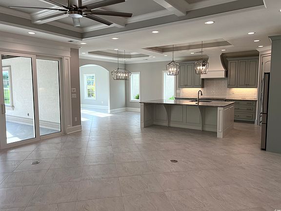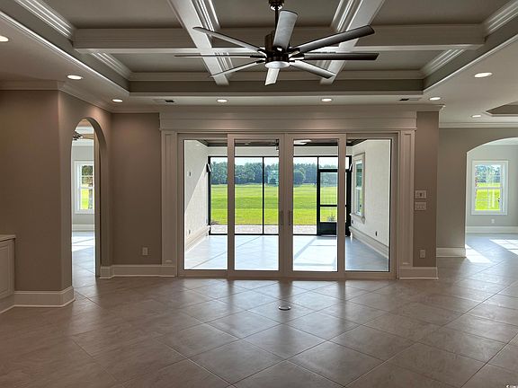 This newly constructed Mediterranean style home is located in the popular Tuscan Sands subdivision at Barefoot Resort and Golf. It sits on the largest lot size of all homes viewing the golf range. Some features include coffered ceiling in the living room, tray ceilings in the master and junior master bedrooms, kitchen, dining room, and Carolina room, as well as a twelve (12) foot wide quad slider unit leading to a screen enclosed outdoor lanai. Other details include custom cabinetry in the kitchen, master bath, both guest baths, powder bath, and laundry room, high level granite for all kitchen, bathroom, and laundry room countertops, stainless steel GE Profile appliances, rounded bullnose corners, custom fans and lighting, a 42" custom iron front door, and the garage is finished and includes a custom chip polyaspartic floor coating. The entire floor, including the outdoor lanai, features 24"x24" porcelain tile. This home has over 2,600 square feet of air conditioned living area and is just over 3,500 total square feet. This house was meticulously constructed and exudes quality craftsmanship. If you are looking for a house built with extra care and attention to detail, this is it.