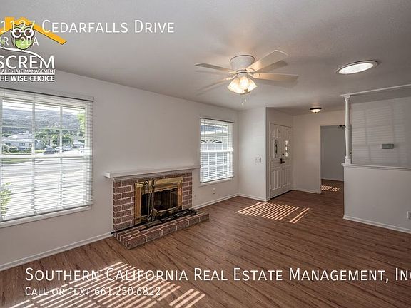 This charming single-story home in Santa Clarita features four bedrooms and an additional bonus room. Upon entering through the double doors, you are greeted by an open living room with a brick fireplace, a mantle, and laminate flooring that resembles wood. Adjacent to the entrance is the bonus room, which includes a ceiling fan and access to the garage. The spacious kitchen boasts granite countertops, beautiful wooden cabinets and drawers with brushed bronze hardware, a tiled backsplash, and stainless-steel appliances, including a gas stove, single oven, dishwasher, microwave, and refrigerator (not pictured). The dining area, conveniently located just off the kitchen, has a large sliding glass door that opens to the private backyard. The backyard features a covered patio with a ceiling fan and fruit trees. There are three guest rooms, each equipped with ceiling fans and wood laminate flooring, as well as a full guest bathroom. The primary bedroom is spacious and includes a ceiling fan and an attached bathroom with a walk-in shower. Additionally, the home has a two-car garage that includes a full-size washer and dryer. This property is conveniently close to an elementary school, shopping centers, and restaurants. *The owner may consider a small pet.
