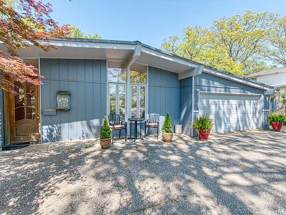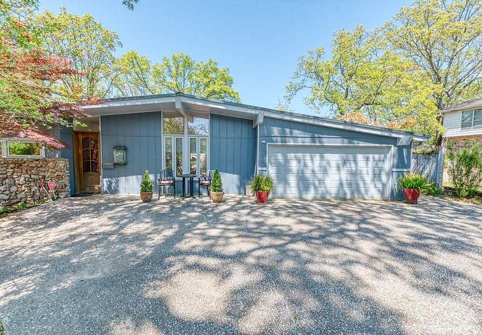 Mid-Century Modern home was originally 3 BR 2 Bath & can be converted back. New siding, roof, flooring, kitchen & bath beautifully updated w/leathered granite & 6 burner gas stove. Living area with FP, dining area and kitchen are all open. The bath features new tub, large walk-in shower & tile flooring. High ceilings with wall to floor windows overlooking very private backyard which is a paradise with koi pond, extensive landscaping, a firepit, pergola and huge deck area. Newer HVAC & HWH. SF is est.
