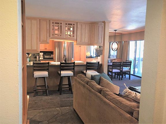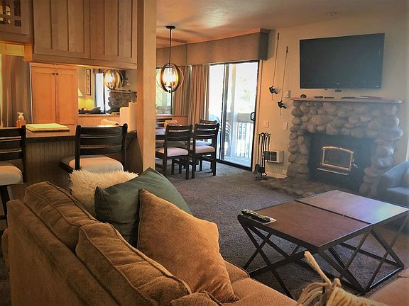 Beautifully remodeled spacious condominium with an 'open room' concept featuring Custom kitchen cabinetry, newer appliances and a 50" flat screen in the living room. Some of the upgrades that may not be obvious; extra wall insulation, enlarged showers, over sized water heater, dual pane windows and closet organizers. River rock fireplace is an warm inviting focal point in the living room and there is a large master en suite bedroom. The condo is situated in the complex with easy access to the pool, tennis court, spa and Rec. room. Perfect location for both winter and summer fun. Town shuttle is steps away and stores, restaurants and theater is a short stroll from your Mammoth Home! Buyer shall be responsible for any required fireplace retrofitting but current wood burning appliance is EPA certified. Professional photos coming!