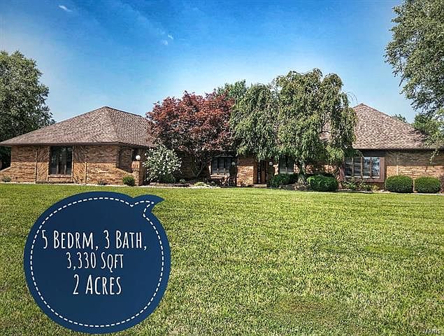 This home will not disappoint! Peace & quite, beautiful sunsets & 2 acres w/ mature trees compliment this stately, well maintained, all brick, 5bdrm, 3 bath home. Spacious kitchen is finished w/ double ovens, large center island, corian countertops, downdraft cooktop, & the abundance of cabinet space will be sure to impress. Large sunken great room w/ cathedral ceiling is completed by a gas burning fireplace w/ granite surround & flanked by new sliding doors that lead out to the large patio. Master bathroom suite is custom designed w/his & her 1/2 baths and a Jack and Jill luxurious spa-like shower. His & her walk-in closets are completed w/ custom shelving by New Space. Large, main level laundry Rm is finished off w/ 5 custom built-in lockers for all the kids dropoffs. Just outside of city limits, walking distance to parks, shopping, dining & just 35 minutes to downtown St Louis or Scott AFB. Call your favorite agent & ask for the list of updates.