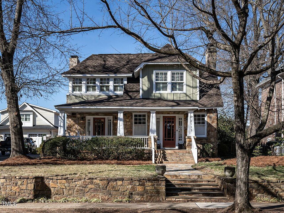 Hayes Barton! Charming stone two-story with covered front porch overlooking one of Raleigh's prettiest streets - beyond its incredible location, the home underwent a significant addition (1999) along with several more recent updates which further enhance the period charm - the inviting light-filled foyer includes a fireplace and extended stairwell that is flanked by living/dining rooms that lead to the kitchen/family area - the gourmet kitchen features Viking/Bosch appliances and is adjoined by a butlers pantry and breakfast area - the generously proportioned family room is centered by a fireplace with French doors to the slate patio (18x16) - the second floor features four bedrooms including the primary suite with fireplace/Kohler soaking tub/walk-in shower and his-n-her closets - front/back stairs - 8'8'' ceilings (down) - 4 fireplaces - plantation shutters - detached garage with separate office/studio/exercise - private, fenced backyard framed by mature foliage - excellent schools - awesome neighbors!