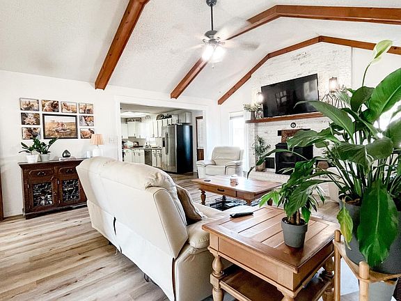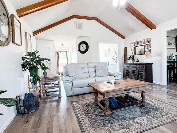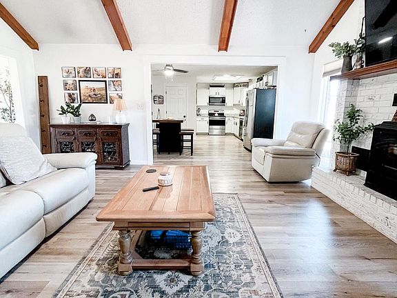 This home is nestled in a neighborhood not many people know about on the edge of town. Features include luxury vinyl flooring through most of the house, tile in the bathrooms and brand-new carpet in bedrooms. The roof, gutters and fascia are 2 years old. When you walk in it opens up to a big 20ft by 16ft living room with beams across the ceiling and the fireplace as the focal point. The fireplace is only 5 months old, high end pellet stove. The perfect blend of modern updates with cozy comfort. The open layout connects the dining room and the kitchen, making a great space for entertaining. The kitchen boasts sleek granite countertops, stainless steel appliances, industrial sink and faucet. Walk out to the backyard on a deck that offers tons of space for entertaining. The backyard is massive, all privacy fenced in, with a small basketball court, garden beds, mature landscaping around the house and along the back fence. There is also a big 24 ft by 12 ft shed that has power to it. There is a side yard that is currently fenced for chickens. An absolutely lovely neighborhood, it's calm, quiet and safe.